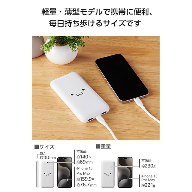 たっぷり使える10000mAhで長時間の外出時も安心。持ち運びしやすい薄型形状のモバイルバッテリーです。