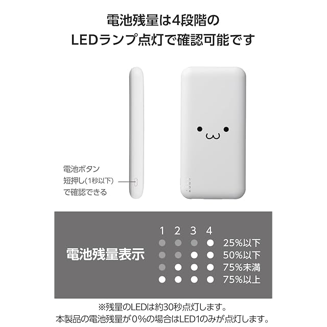 本製品(バッテリー容量10000mAh)で、1800mAhのスマートフォンを約3.3回、3000mAhのスマートフォンを約1.9回充電可能です。