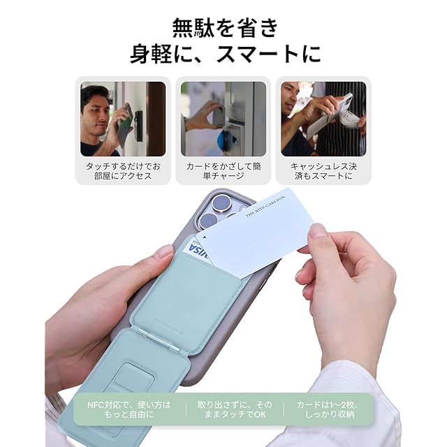 【NFCカード対応!かざすだけでアクセス】マイナンバーカードや運転免許はもちろん、お札や名刺、Suicaなどの交通系ICカードやタッチ決済に対応したクレジットカード、カードキーまで収納可能。カバンから取り出す手間なく、本体ごとタッチするだけでスムーズな決済が可能です。カードケースには1~2枚のカードまで収納できますが、NFC機能を使用するためには、カードを1枚だけ入れてください