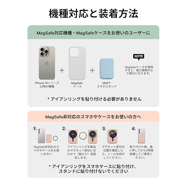 【アイアンリング付き・全機種対応】この携帯スタンドは iPhone 16/15/14/13/12シリーズ(Pro/Pro Max/Plus/Mini含む)に対応。。背面にマグネットが付いていないスマートフォンも、付属のアイアンリングをスマートフォンケースに取り付けるだけで、MOFT 8-in-1多機能スタンドを使用できます。 製品にはマグネットリングが付属しています。取り付け方法については、詳細ページの動画をご参照ください。【注意:粘着面がある側はスマホケースまたはスマホの背面に貼り付けてください。スタンドには貼り付けないでください。】