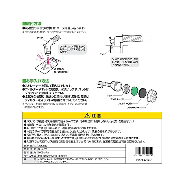【取付方法】1洗濯機の風呂水給水口にホースを差し込みます。その際に、ツギテのツメがはまってカチッというまで差し込みます。2フィルター部分を浴槽に付けます。