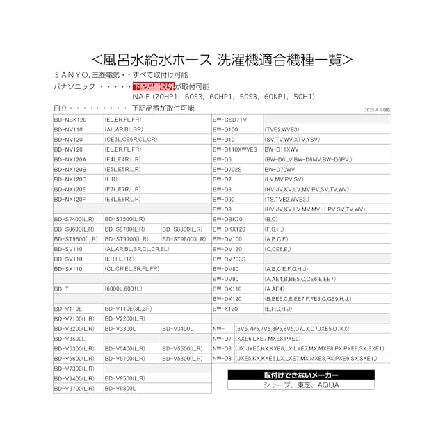 【取付可能なメーカー】三洋電機・三菱電機の風呂水給水機能付き全自動洗濯機すべて/パナソニック[NA-F70HP1・NA-F60HP1・NA-F60KP1・NA-F60S3・NA-F50S3・NA-F50H1を除く]の風呂水給水機能付き全自動洗濯機すべて・日立製作所[適合品番は、商品説明欄に記載]