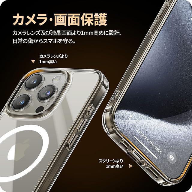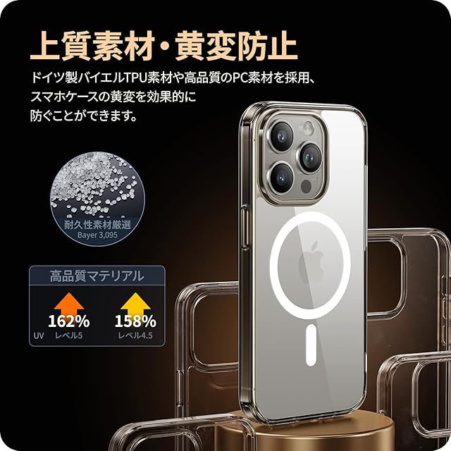 【驚くほどの透明度・黄変防止強化】背面は高透明度ポリカーボネートの素材で、スマホ本来の崇高な美しさと色をそのままに生かし、本体の高級感にも劣らない美しさです。ドイツ製バイエルTPU素材や高品質のPC素材を採用、TPU高分子にUV剤を添加し、黄変防止レベルは4.5級を獲得。スマホを長時間使用しても光沢感、透明感を保つことができます!