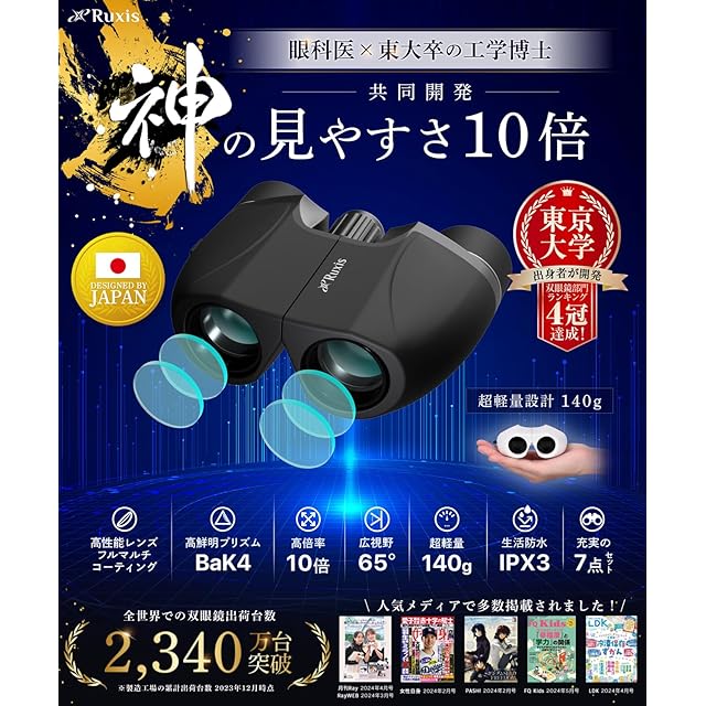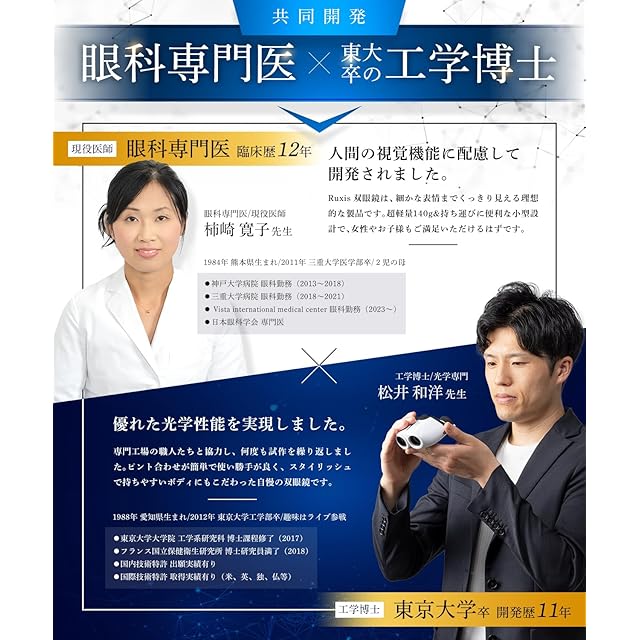 ✅【 眼科医x東大卒の工学博士が開発 】現役医師で眼科専門医の柿崎寛子先生(臨床歴12年)と、東京大学出身で工学博士の松井和洋先生(開発歴11年)が共同開発。現代医学と先端光学の知見を融合し、”驚きの見やすさ”を実現した人気の双眼鏡です。