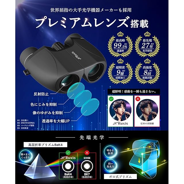 眼科医と工学博士が共同開発!Ruxis双眼鏡(オペラグラス)は、現代医学と先端工学の知見を融合し、”究極の見やすさ”を実現しました。シリーズ史上最高水準の透光率99.5%以上を達成したプレミアムレンズを搭載。業界最軽量140gでスマホより軽く、片手で持っても疲れ知らずです。ライブやコンサート、スポーツ観戦など様々なシーンで活躍し、推し活でも人気の双眼鏡です。