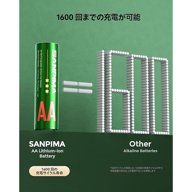商品名:SANPIMA 単3形リチウム充電池8本 1.5V 大容量3000mWh/2000mAh 急速充電器付き 約1600回充電可能 1-8本同時充電 2.5時間充電 自然放電抑制
