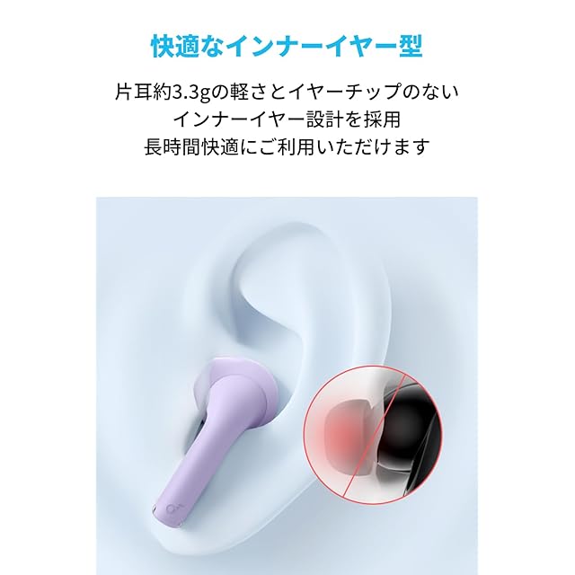 快適なインナーイヤー型:片耳約3.3gの軽さとイヤーチップのないインナーイヤー設計。長時間の使用でも疲れにくく、オンライン会議や授業など長時間利用のシーンでも快適にご利用いただけます。