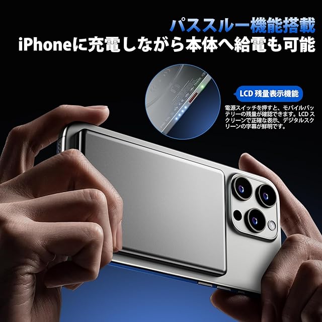 【注意事項】:①モバイルバッテリーのMagSafe充電はiPhone12-16のみに対応しています。MagSafe充電を使用する場合は、製品写真のようにUSB-Cポートを下向きにして、携帯電話に磁気的に取り付けた状態で使用してください。②電源ボタンを1回押すだけで電源を入れることができます。長押しも2回押す必要もありません。次に、充電位置を調整してください。③誤ってスイッチに触れないように、スイッチボタンは中央に固定され、両側にわずかに可動します。ボタンを振るとわずかに音がしますが、製品内部の音ではありませんので、安心してご使用ください。モバイルバッテリーに衝撃を与えることはできず、また、携帯電話以外の重い物をモバイルバッテリーの上に置くこともできません。④モバイルバッテリーが熱くなるのは正常です。温度が高い場所では使用しないでください。⑤モバイルバッテリーが複数のデバイスを同時に充電したり、充電しながら携帯電話を使用したりすると、モバイルバッテリーの電力が分散されますが、これは正常です。