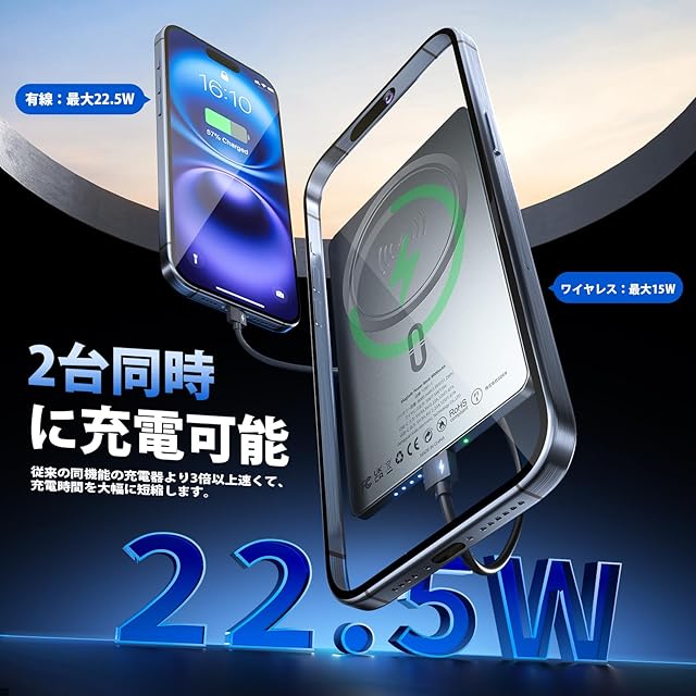 【超強力なマグネット&安全機能】:このモバイルバッテリー マグネットは内部に超強力の磁石を搭載しており、ワイヤレス充電器を使用した際の脱落を防ぎます。さらに、マグネット対応の保護ケースを装着した状態でも充電が可能です。過過充電保護、過熱防止、漏電保護など各種保護機能を備え、PSE、FCC、RoHSなどの認証をクリアし、パワフルかつ安全な充電をご提供いたします。長時間安心してお使いいただけます。
