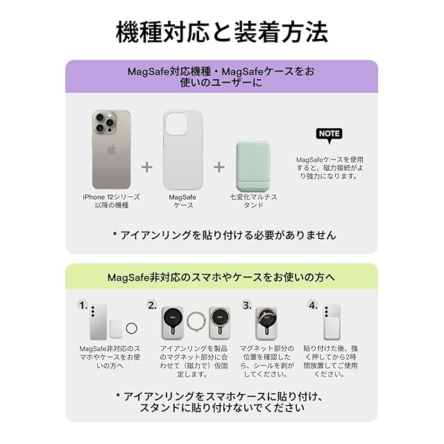 【アイアンリング付き・全機種対応】この携帯スタンドはiPhone 15 Pro Max/ iPhone 15 Pro/ iPhone 15 Plus/ iPhone 15/ iPhone 14 Pro Max/ iPhone 14 Pro/ iPhone 14 Plus/ iPhone 14/ iPhone 13 Pro Max/ iPhone 13 Pro/ iPhone 13/ iPhone 13 Mini/ iPhone 12 Pro Max/ iPhone 12 Pro/ iPhone 12/ iPhone 12 Mini すべてのシリーズに対応しています。背面にマグネットが付いていないスマートフォンも、付属のアイアンリングをスマートフォンケースに取り付けるだけで、MOFT七変化マルチスタンドで使用できます。 製品にはマグネットリングが付属しています。取り付け方法については、詳細ページの動画をご参照ください。【注意:粘着面がある側はスマホケースまたはスマホの背面に貼り付けてください。スタンドには貼り付けないでください。】