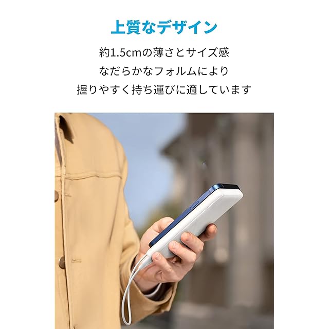 Anker PowerCore Slim 10000<br> 薄型でコンパクトな大容量モバイルバッテリー(10000mAh)<br><br> 主な製品仕様<br> サイズ:約149 x 68 x 14 mm<br> 重量:約206g<br> 入力:5V=2A<br> 出力:5V=2.4A<br><br> Anker:全米No.1 USB充電機器ブランド<br> - 最先端技術よる高速かつ安全な充電<br> - 3000万人以上が支持する信頼の品質<br><br> 驚きの薄型デザイン<br> PowerCore Slim 10000は容量に対して驚くほど薄型で軽量なモバイルバッテリーです。最新のスマートフォンとほぼ同じ大きさと重さでありながら、ほとんどのスマートフォンに2回以上、タブレット端末に1回以上のフル充電が可能です。約1.4cmの薄さでポケットにすっぽり収まります。仕事や旅行の持ち運び用にも最適です。<br><br> フルスピード充電技術<br> Anker独自技術のPowerIQとVoltageBoostにより最大2.4Aでのフルスピード充電が可能です(※Qualcomm Quick Chargeには対応していません)。<br><br> 選べる入力方法<br> バッテリー本体充電のために、USB-CとMicro USB入力ポートをどちらも搭載し、お使いのケーブルに合わせてお選びいただけます。<br><br> 最先端の安全性<br> Anker独自の多重保護システムにより、長期間安心してお使いいただけます。あなたとお使いの機器の安全を守ります。<br><br> 世界でも名高い製品<br> Ankerは弊社製品に絶対の自信を持っています。そのため、18ヶ月と品質の高いカスタマーサポートを全ての製品に提供しています。<br><br> 注意:<br> ・本製品には、USB-Cケーブル、ライトニングUSBケーブル、ACアダプターは付属しておりません。<br> ・低電流モードに切り替えると、本体の充電残量にかかわらず、LEDインジケーターのひとつが緑色に点灯します。Bluetoothイヤホンなどを充電する際には、低電流モードを推奨します。<br> ・2つの入力ポートを同時に使用しないでください。USB-Cポートは入力専用です。<br> ・入力専用用のUSB-CポートはPower Delivieryには対応しておりません。<br> ・本製品はQualcomm Quick Chargeには対応しておりません(5V / 2.4A 最大12Wでの出力ですのでご注意ください)。<br> ・製品を正常に充電するために5V/2A以上出力できる充電器をご用意ください。<br>