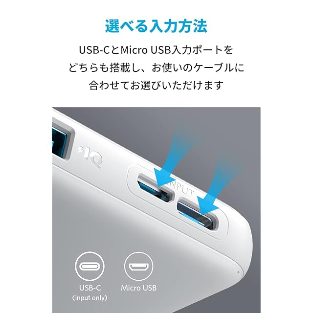 選べる入力方法:モバイルバッテリー本体の充電のために、USB-CとMicro USB入力ポートをどちらも搭載し、お使いのケーブルに合わせてお選びいただけます(※2つの入力ポートを同時に使用しないでください)。
