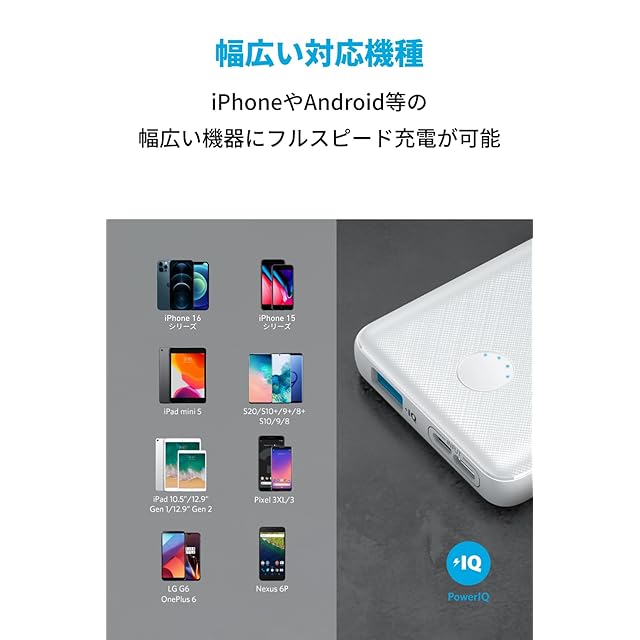 薄型、でも大容量:PowerCore Slim 10000は、業界トップクラスにスリムで軽量なデザインながら、iPhone 14に約2回、iPad mini 5に約1.3回、その他ほとんどのスマートフォンに複数回の充電が可能です。