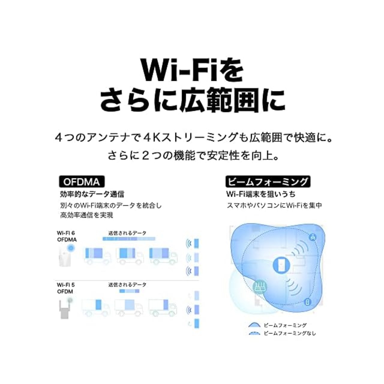 ビームフォーミングが接続デバイスに無線信号を集中させ、WiFiの範囲とネットワークパフォーマンスを向上させます。