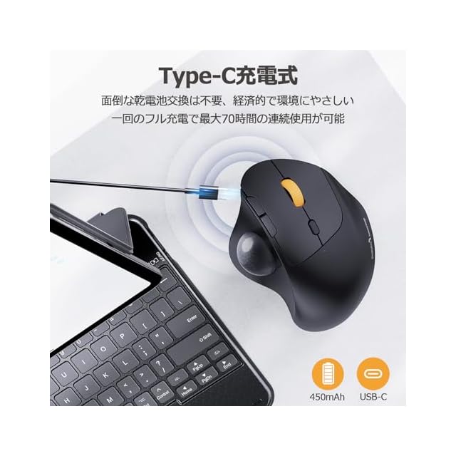 【USB-C充電式・長期間使用可能】面倒な電池交換が不要で、経済的で環境にも優しい充電式トラックボールマウスです。450mAhの大容量バッテリーを内蔵しており、一度のフル充電で最大70時間の連続使用が可能です。また、便利な電池残量表示ランプが付いており、電池切れを心配することなく作業に集中できます。