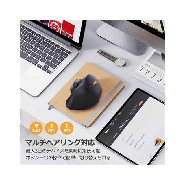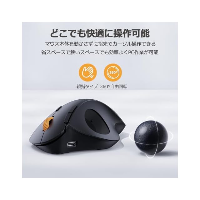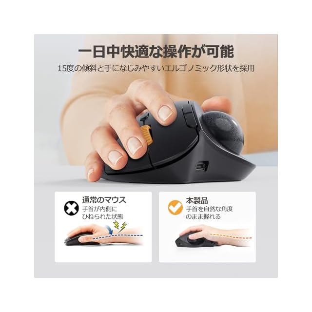 【一日中快適に操作できるトラックボール】最新版人気トラックボールマウスが登場しました!15度の傾斜と手になじみやすいエルゴノミックな形状が採用されており、手首をひねることなく自然な角度で本体を握れるため、長時間でも快適に作業が可能です。また、無線タイプなので、ケーブルの煩わしさから解放されます!さらに、親指で操作するトラックボールマウスは、本体を動かす必要がないため、場所を取らず、膝の上やソファ、乱雑なデスクなどの狭いスペースでも快適なカーソル操作を実現できます。シンプルで使いやすいので、初心者の方におすすめです。(※注意: 本製品は手の小さい方には不向きで、中~大サイズの手に最適です。手のひらの下の細いしわから中指の先端までの長さが17.5cm以上。)