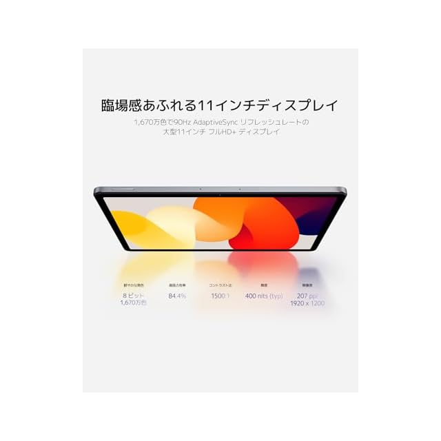 【スムーズな操作感】1,670万色で、最大90Hz まで自動調整されるリフレッシュレートに対応した大型11インチ フルHD+ ディスプレイが、毎日のエンタメをより鮮やかに、よりスムーズにし、すばらしいビジュアル体験をお届けします。また、TÜV Rheinland 低ブルーライト認証とTÜV Rheinland フリッカーフリー認証を取得しているため、長時間の使用でも目にやさしく、安心してお使いいただけます。
