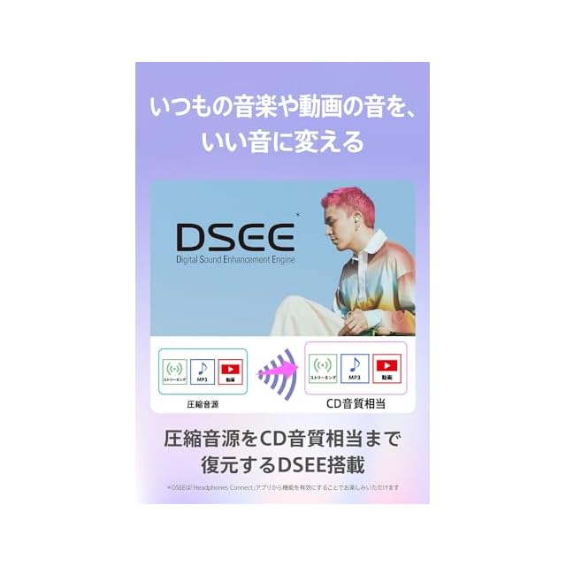 高音から低音までバランスが良く、特にボーカルや楽器の音を自然でクリアにお楽しみいただけます。さらに、ソニーの独自開発技術「DSEE」(*)により、圧縮された音源で失われがちな高音域をCD音質相当までヘッドホン内で補完します。ストリーミング再生やMP3、Bluetoothの伝送コーデックなどにより圧縮された音源を、広がりのあるいい音で再生します。* DSEEは『Headphones Connect』アプリから機能を有効にすることでお楽しみいただけます