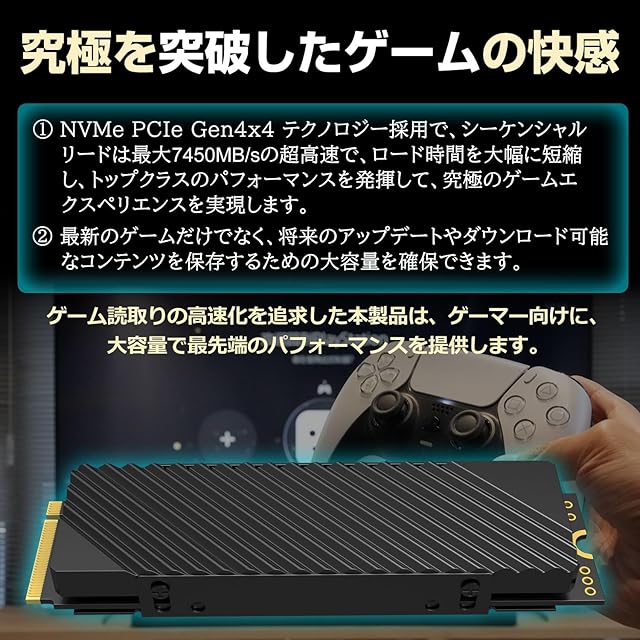 HanyeのPCIe NVMe M.2 2280内蔵型SSDはPCI Express 4.0x4インタフェースを採用、PCIe Gen4x4の広帯域幅によって、より高速なデータ転送を実現します。<br> 高性能ゲーミングパソコンやPS5向け;アルミ製ヒートシンク搭載で放熱性を大幅に高めています。PS5の限られたスペースでも、効率良く放熱を促し、ゲームソフトの強制終了や転送速度の低下を防ぎます。<br> シーケンシャルリード(最大):7450MB/s、シーケンシャルライト(最大):6700MB/s <br> ※ホスト機器、インターフェース、使用状況、その他の状況によって読み出し/ 書き込みの速度は異なる場合があります。<br> 動作温度範囲:0~70℃、保存温度範囲:-45~95℃、動作電圧= 3.3V ±5% ;<br> 外形寸法(mm):SSD本体 80.0±0.15 x 22.0±0.15 x 2.05±0.08;ヒートシンク含む80.0±0.15 x 23.3±0.15 x 8.5±0.35;<br> :安心の国内サポートとメーカー5年。<br> ※は、最初の購入日から5年間、または製品データシート上(取扱説明書)に記載されている最大書き込みバイト総数1500Terabytesが書き込まれるまでのうち、いずれか早く到達する日まで有効です。<br> ※PS5への取り付けの際、必ずPS5に付属のスペーサーを「80」と表記されたホールに装着してからネジ締めを行ってください。スペーサーは未装着の場合、及びネジを強く締めすぎるとM.2 SSD本体の破損につながる恐れがあります。<br> ※PS5やPCなどのM.2スロットへSSDを取り付ける際にヒートシンクをつかんで押し込むとヒートシンクがズレてしまう可能性がございますので。SSD後端の基板をつかみながらM.2スロットへ押し込んでください。