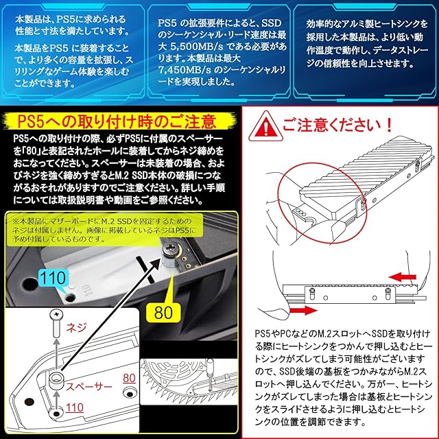:安心の国内サポートとメーカー5年。※は、最初の購入日から5年間、または製品データシート上(取扱説明書)に記載されている最大書き込みバイト総数1500Terabytesが書き込まれるまでのうち、いずれか早く到達する日まで有効です。※PS5への取り付けの際、必ずPS5に付属のスペーサーを「80」と表記されたホールに装着してからネジ締めを行ってください。スペーサーは未装着の場合、及びネジを強く締めすぎるとM.2 SSD本体の破損につながる恐れがあります。 ※PS5やPCなどのM.2スロットへSSDを取り付ける際にヒートシンクをつかんで押し込むとヒートシンクがズレてしまう可能性がございますので。SSD後端の基板をつかみながらM.2スロットへ押し込んでください。※本製品にマザーボードにM.2 SSDを固定するためのネジは付属しません。