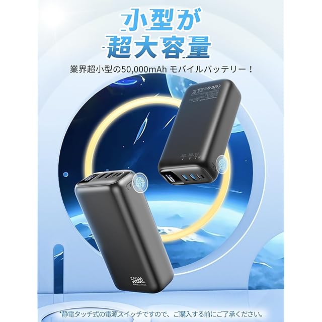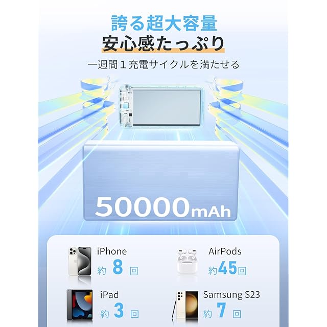 ✨【2025年新登場・待望の大容量モデル】業界でもトップクラスの人気と実用性を誇る、弊社待望の新作50000mAh大容量モバイルバッテリー「P5」がついに登場!⚡急速充電と超長時間の待機が本製品の最大の特長で、日常生活で大活躍すること間違いなし。1000回以上の充電サイクルを誇る長寿命と高い安全性を実現したリチウムイオン電池を採用し、Quick Charge3.0&Power Delivery認証に対応したスマートフォンやタブレットを超高速で充電可能。旅行先では家族とシェアしたり、出張中に仕事用・プライベート用の端末を同時に充電できる頼もしい容量です。ポケットやリュックにすっぽり収まるコンパクトサイズで、出張や旅行などの短期間の外出はもちろん、台風や地震などの災害時の緊急電源としても大いに役立ちます。