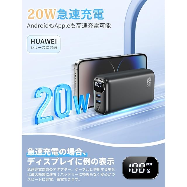 ✨【50000mAh大容量・22.5W超急速充電】スマートフォンの利用が日常不可欠な今、出張や旅行中にバッテリー切れで困ることも多いでしょう。弊社の「P5」は、モバイルバッテリー業界でも貴重な50000mAhの超大容量を備えており、一度の満充電で数日間充電不要。また、アメリカQualcomm社が開発したQuick Charge3.0に対応し、通常の急速充電よりも圧倒的に速い3.0A出力で充電可能です。さらに⚡PD(Power Delivery)およびAFC/FCP/SCPに対応し、最大20W出力のUSB Type-Cポートと最大22.5W出力のUSB Type-Aポートを搭載。Apple製スマートフォンやタブレットはもちろん、ほぼすべてのAndroidデバイスにも対応し、快適な急速充電を実現します。このバッテリーさえあれば、外出先でもスマートフォンやタブレットを思う存分使えます。