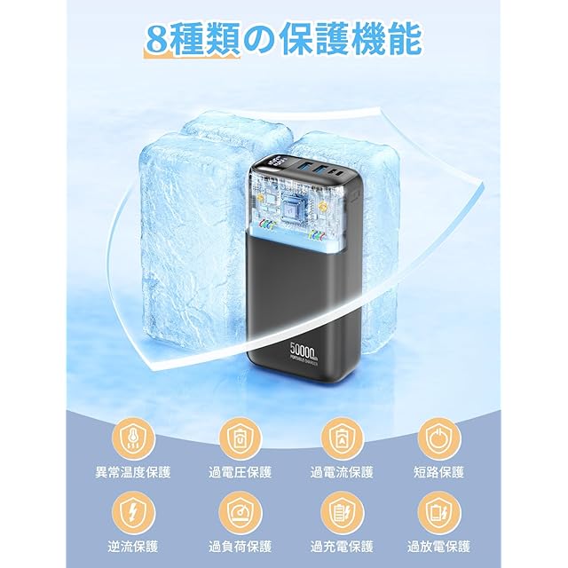 ✨【安全性を追求した多重保護システム・PSE安全マーク取得済み】お客様に安心・安全にご使用いただけるよう、本製品には燃えにくい難燃性の高い素材を採用。さらに、電池と筐体の間に十分なスペースを確保し、バッテリーへの負担を軽減する設計を施しました。独自の保護機能パッケージにより、過熱・過充電・過放電・過電流・過電圧防止機能、短絡保護機能、逆流防止・過負荷保護など8つの安全機能を搭載。万が一ショートが発生した際も、自動的に充電を停止するため、安心してご利用いただけます。さらに、PSE安全マーク取得済みで、大容量ながら安全性を最優先した設計となっており、信頼できる一台です。【パッケージ内容】50000mAhバッテリー本体×1、Type-Cケーブル×1、日本語取扱説明書×1