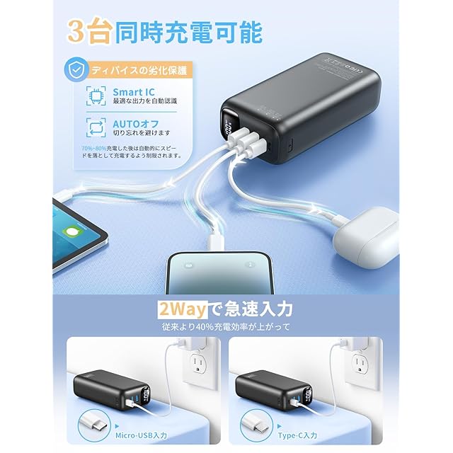 商品名:モバイルバッテリー 大容量 【大容量&3台同時充電&22.5W/PD20W】 急速充電 バッテリー 携帯充電器 USB-Type C入出力ポート LED残量数字表示 スマホ充電器 コンパクト 持ち運び便利 LEDライト付き PSE認証済 iPhone/iPad/Android各種スマホ対応 旅行/出張/アウトドア/停電/防災緊急用 日本語取扱説明書