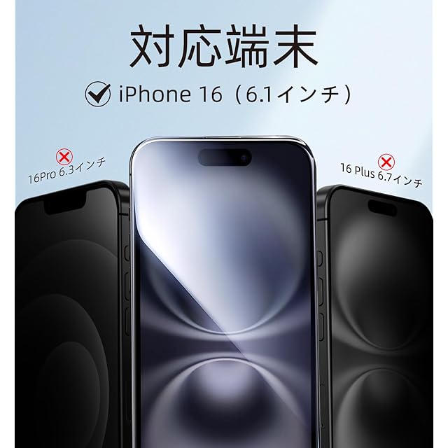 対応端末:iPhone 16<br> パッケージ:18.7 x 16.4 x 1.5 cm<br> パッケージ内容:覗き見防止ガラスフィルム2枚、ツールパッケージ2個、説明書1本<br> 機能:ガイド枠付き、貼りやすい、スクラッチ防止、耐衝撃、飛散防止、高透過率、高感度、タッチ感度良い、気泡レス、指紋防止、9H硬度、ケースと併用できる<br> 規格:9H硬度、飛散防止加工、撥油加工<br>