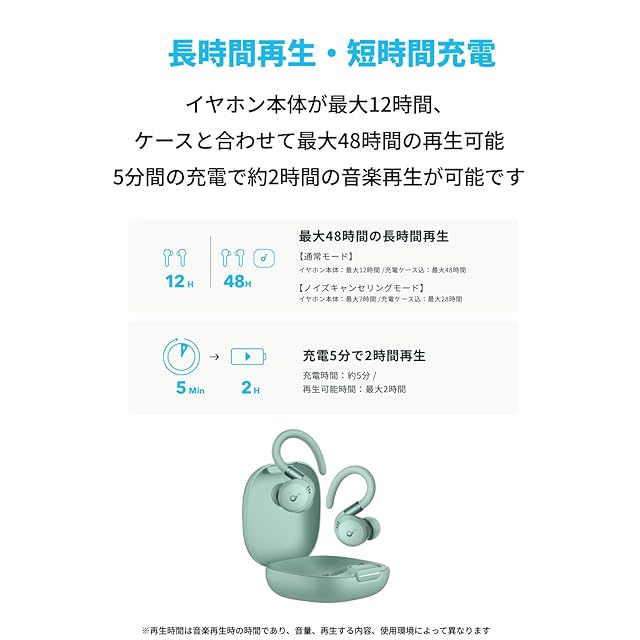 長時間再生・短時間充電:イヤホン本体が満充電の状態で最大12時間、付属の充電ケースを合わせて使えば最大48時間の音楽再生が可能です。また、5分間の充電で約2時間の音楽再生が可能です。