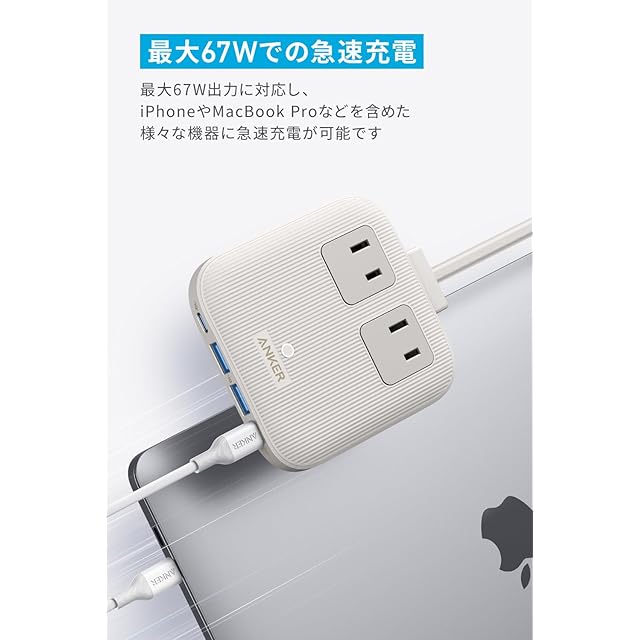 商品名:Anker Nano Charging Station (6-in-1, 67W) (USBタップ 電源タップ AC差込口 2口 USB-C 2ポート USB-A 2ポート 延長コード 1.5m) 【PSE技術基準適合】MacBook PD対応 Windows PC iPad iPhone Galaxy Android スマートフォン ノートPC 各種 その他機器対応 (ホワイト)