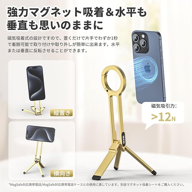【超強力磁気、安定感抜群】MagSafe用スマホホルダーは業界最強磁力の磁石を使用して、超強力磁気で、簡単に脱着しません、安定で安心に使用いただけます。両面磁気があり、表側は携帯電話を吸着でき、裏面はLEDライト、スマホレンズフィルターキットなどのアクセサリーを吸着ことができます。ご注意:スマートフォン用ケースを装着している場合、製品の吸着に影響します。携帯電話ケースと併用する場合は、MagSafe対応のケースを使用する必要があります。
