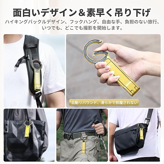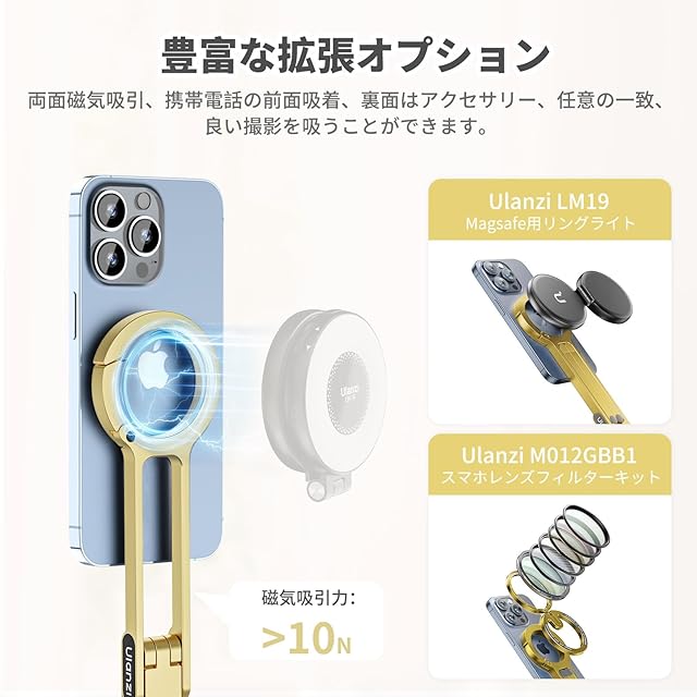 【Magsafe用 折りたたみ式 スマホ三脚 】Ulanzi MA30 Magsafe スマホ三脚ではスマホを固定する部分が強力マグネットへ進化しスマホをしっかり吸着固定します。片手でわずか0.1秒簡単に取付可能です。簡単に拡張したり折りたたんだりできるので、三脚としてだけでなく、デスクでスマホスタンドのように使ったり、セルフィーを撮影するために自撮り棒のようにも使えたり、一台で何役もこなす優れものです。軽量ながらも強度の高いアルミニウムを採用し、頑丈な三脚構造と滑り止めシリコンパッドにより、スマートフォンの落下を防ぎます。ハイキングバックルデザイン、フックハング、自由な手、負担のない旅行、いつでも、どこでも撮影を開始します。ご注意:本製品は携帯電話ホルダーとしてのみ使用され、エクストリームスポーツやプログレードの登山用バックルではありません。