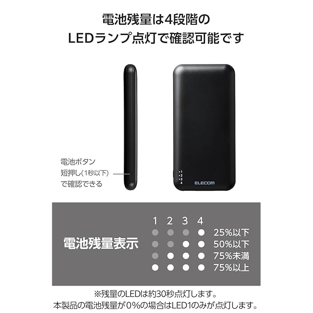 本製品(バッテリー容量10000mAh)で、1800mAhのスマートフォンを約3.3回、3000mAhのスマートフォンを約1.9回充電可能です。