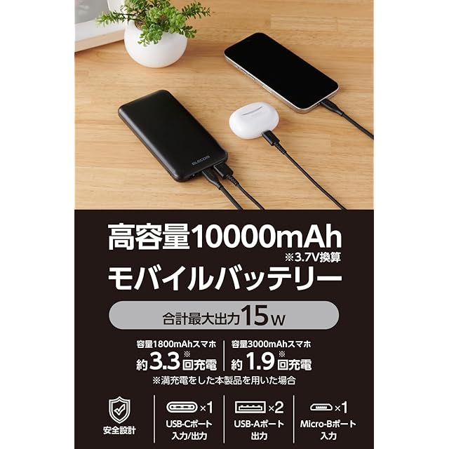 エレコム モバイルバッテリー 10000mAh 15W 3ポート Type-C×1 USB-A×2 microB(入力専用) 機内持ち込み可 PSE技術基準適合 ブラック EC-C37BK | TREND DESIGN 家電専門店