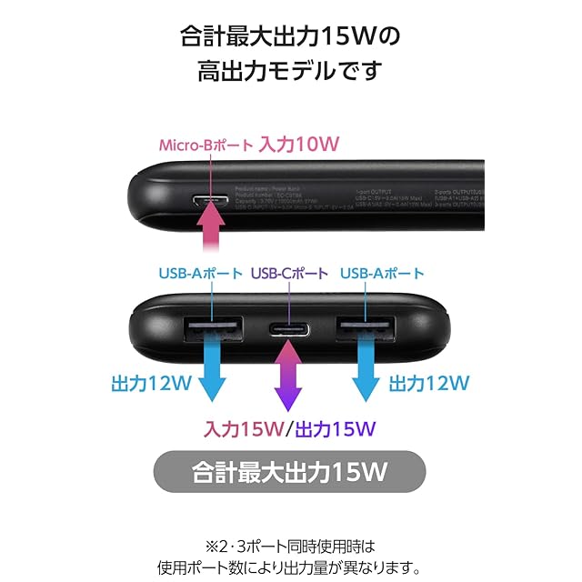 USB-Aポート×2、USB Type-C(TM)ポート×1の3ポートから出力可能。USB-Aポートからは最大12W、USB Type-Cポートからは最大15Wで充電できます。