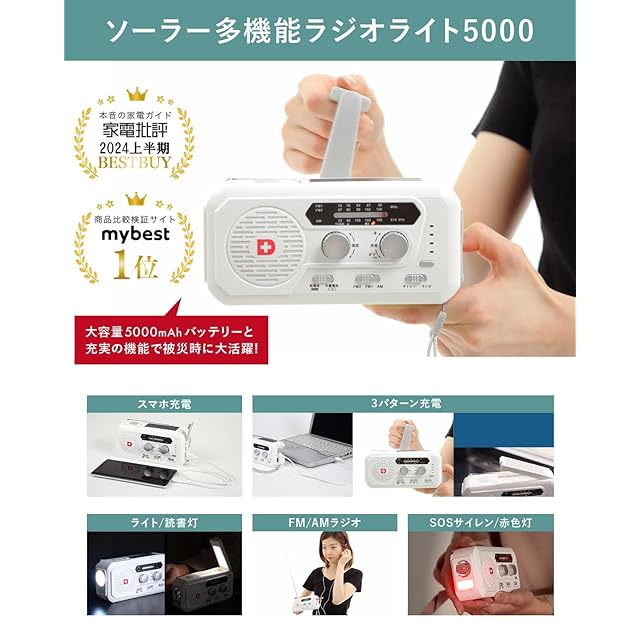 商品名:家電批評ベストバイ受賞 ソーラー多機能 防災ラジオ ライト 5000mAhバッテリー搭載 スマホ充電 手回し 充電3パターン 防災グッズ 防災防犯ダイレクト