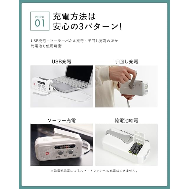 【充電式】USB充電、ソーラーパネル充電、手回し充電のほか緊急用電源として乾電池給電も可能。