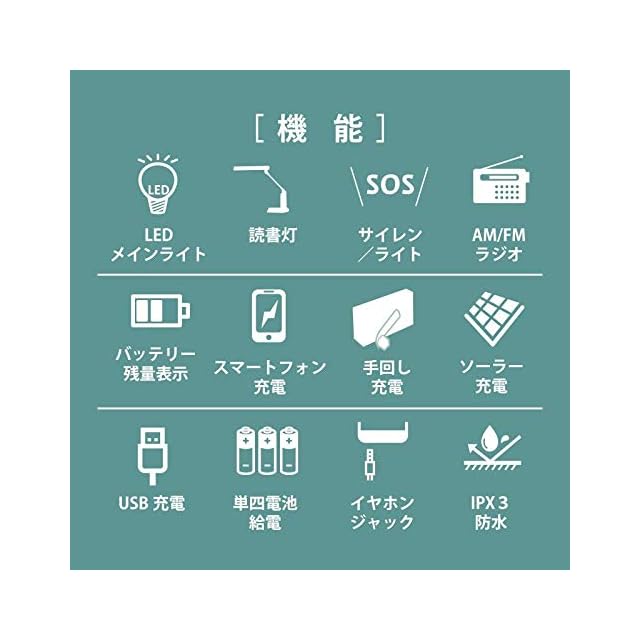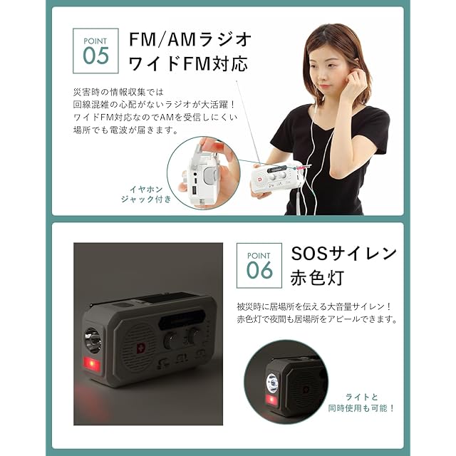 【FM/AM対応】ワイドFM対応でAMを受信しにくい場所でも電波が届きやすい。便利なイヤホンジャック付き。 【SOSサイレン/赤色灯】被災時に居場所を伝える大音量サイレン搭載。赤色灯で居場所をアピール。LEDライトとの同時使用も可能。