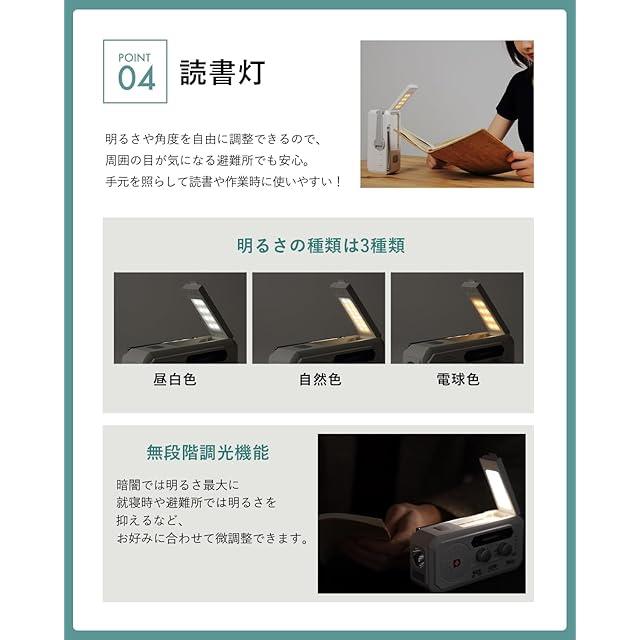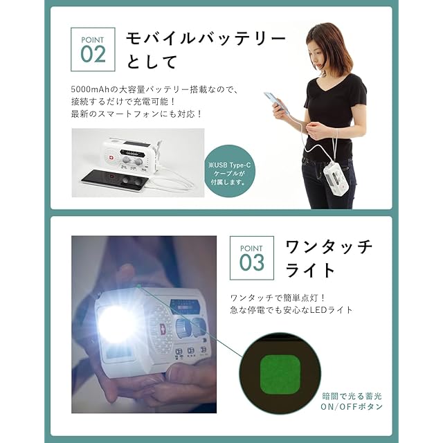 ・ソーラー充電ができる多機能ラジオライト ・大容量5000mAhバッテリー搭載 ・スマホへ接続するだけで充電可能 ・本体への充電はUSB/手回し/ソーラーの3通り ・乾電池でも使用可能 ・ワイドFM対応ラジオ ・読書灯(光色3種・無段階調光) ・暗闇で光る畜光ボタン ・SOSサイレン/赤色灯