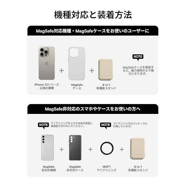 【アイアンリング付き・全機種対応】この携帯スタンドは iPhone 16/15/14/13/12シリーズ(Pro/Pro Max/Plus/Mini含む)に対応。。背面にマグネットが付いていないスマートフォンも、付属のアイアンリングをスマートフォンケースに取り付けるだけで、MOFT 8-in-1多機能スタンドを使用できます。 製品にはマグネットリングが付属しています。取り付け方法については、詳細ページの動画をご参照ください。【注意:粘着面がある側はスマホケースまたはスマホの背面に貼り付けてください。スタンドには貼り付けないでください。】