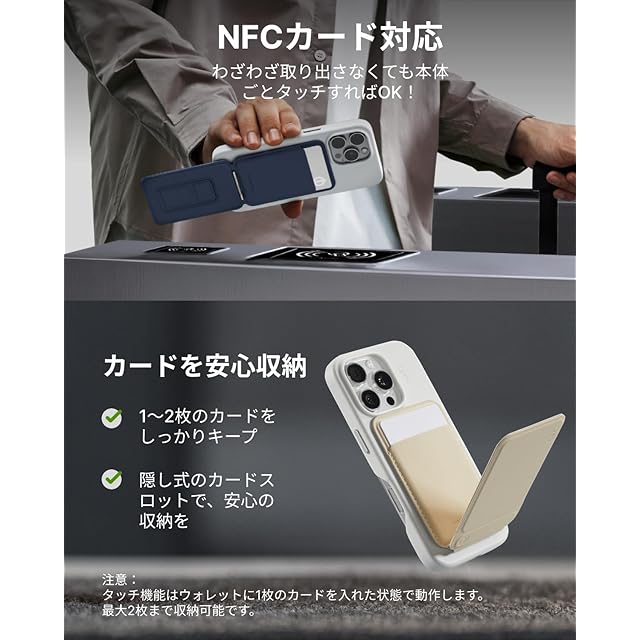 【NFCカード対応!かざすだけでアクセス】マイナンバーカードや運転免許はもちろん、お札や名刺、Suicaなどの交通系ICカードやタッチ決済に対応したクレジットカード、カードキーまで収納可能。カバンから取り出す手間なく、本体ごとタッチするだけでスムーズな決済が可能です。カードケースには1~2枚のカードまで収納できますが、NFC機能を使用するためには、カードを1枚だけ入れてください