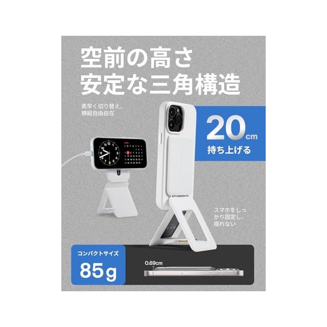【スタンドの新形態・MOFTの集大成】MOFT スマホスタンドはデザイン特許を取得し、一体式の折り畳み構造を採用しております。折り畳み時の厚さがわずか0.74cmのカードサイズから展開して、最大高さ17cmまで頑丈なスマホスタンドに早変わりします。MagSafe対応新鮮な製品形態に加え、MOFT特製のPU素材「MOVAS」を採用されたこの携帯スタンドは、あなたのスマホライフを一変します。