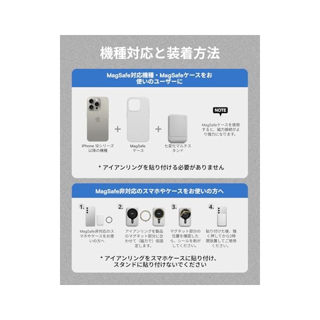 【アイアンリング付き・全機種対応】この携帯スタンドはiPhone 15 Pro Max/ iPhone 15 Pro/ iPhone 15 Plus/ iPhone 15/ iPhone 14 Pro Max/ iPhone 14 Pro/ iPhone 14 Plus/ iPhone 14/ iPhone 13 Pro Max/ iPhone 13 Pro/ iPhone 13/ iPhone 13 Mini/ iPhone 12 Pro Max/ iPhone 12 Pro/ iPhone 12/ iPhone 12 Mini すべてのシリーズに対応しています。背面にマグネットが付いていないスマートフォンも、付属のアイアンリングをスマートフォンケースに取り付けるだけで、MOFT七変化マルチスタンドで使用できます。 製品にはマグネットリングが付属しています。取り付け方法については、詳細ページの動画をご参照ください。【注意:粘着面がある側はスマホケースまたはスマホの背面に貼り付けてください。スタンドには貼り付けないでください。】