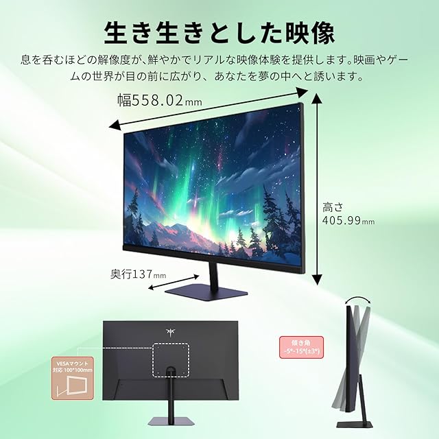 【フルHD IPSパネル】1080Pの高解像度と広視野角で、どんな角度からでも鮮やかな色彩を楽しめます。リアルな色合いで、画像や動画の細部までしっかり再現。仕事もエンターテインメントもこれ一台で。