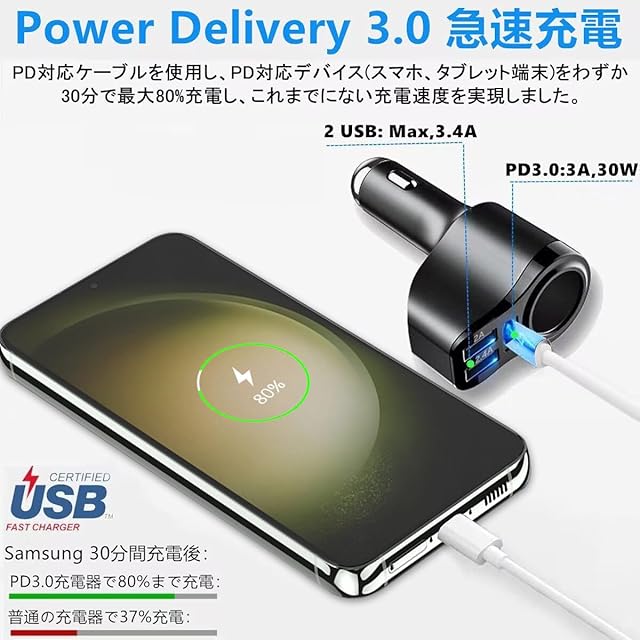 【満足の3ポート ● 3台同時充電】【PD3.0(3.0A)と3.4A(2ポート合計最大)】3usbポートの組み合わせusb車充電器により、Power Delivery3.0対応のUSB-Type-C用ポートを搭載し、フルスピード充電が可能です。PD未対応デバイスに対しても、最適な電流(5V/3.4A 2ポート合計最大)をお送りします。3台端末(iPhone,iPad,Galaxy,Xperia,Android等)を同時に充電可能です。ご注意:急速充電を実現したい場合、PD3.0ポートを使用してください。