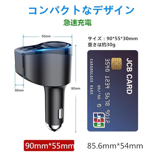【コンパクト ● 軽量】車載充電器の重さは約30gで、最軽量のコンパクトサイズ(90*55*30mm)、どこにでも気軽に持ち運べます。ミニサイズの車用充電器、絶対運転の邪魔にならない。更に、シガーライターの陽極の長さが58mmで、深いソケットでも、きちんと通電できます。シガーライターの陽極と車のソケットの凹部がぴったり固定されます。ご注意:車の種類はさまざまな種類があるので、車の充電器がシガーソケットと完全に平行でない場合があります。ご購入前に、シガーソケットの深さをご確認ください。