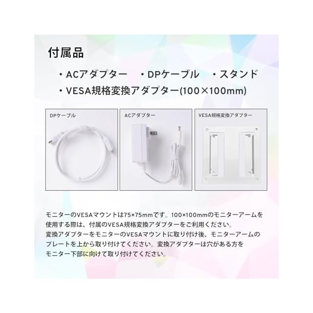 [機能] AMD FreeSync Premium / G-SYNC compatible / Flicker Free / VESAマウント(75mm) / ブルーライトカット / Overdrive / Black Equalizer / スピーカー内蔵(3W ×2)