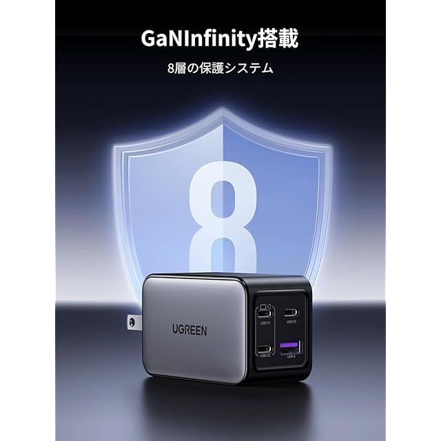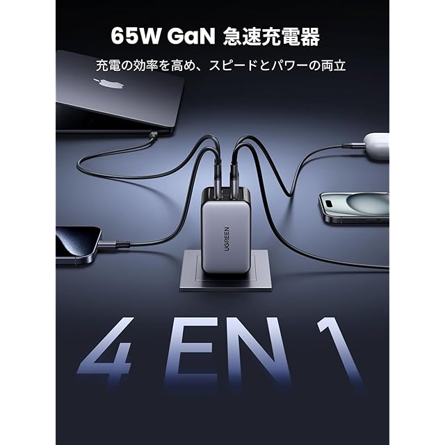 商品名:UGREEN Nexode 65W 急速 充電器【4ポート】USB-C×3+USB-A×1 タイプC PD3.0 GaNII 充電器 iPhone 16/ Android/Galaxy/Macbook/iPad/PC/その他USB-C機器対応 PSE(ブラック)