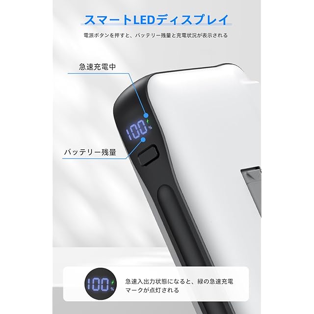 【便利なLCDディスプレイ&コンパクトなサイズ】 バッテリー残量、急速充電の状態をリアルタイムに表示するLCDディスプレイ付きであります。モバイル充電器本体のサイズは11.25x5.64x3.13cmで、重さはわずか227gで、コンパクトで持ち運びに最適です。バックに簡単に収納でき、手に持っても負担になりません。